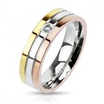 Cet anneau large aux arêtes arrondies ourlées d'un liseré doré est cerclé d'un ruban en bel acier granité qui prend des reflets de satin.